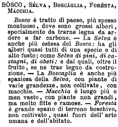 | Bosco, Selva, Boscaglia, Foresta, Macchia - Bosco è tratto di paese, più spesso montuoso, dove sono grossi alberi, specialmente da trarne legna da ardere e far carbone. - La Selva è anche più estesa del Bosco: ha gli alberi quasi tutti di una specie e di alto fusto; come Selva di pini, di castagni, di abeti; e dai quali, oltre il frutto, se ne trae legno da costruzione. - La Boscaglia è anche più spaziosa della Selva, con piante di varie grandezze, non coltivate, con macchie. - Macchia è luogo più o men vasto, con piante non grandi, ma molto fitte e ramose. - Foresta è grande spazio di terreno boschivo, non coltivato, quasi fuori dell'arte umana e dell'abitato. [immagine] |