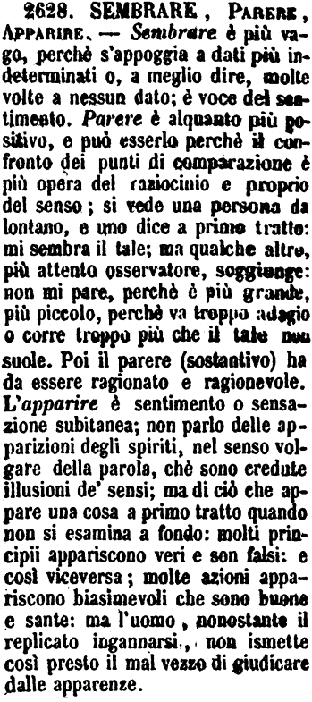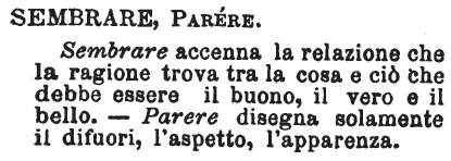 Sembrare, Parere - Sembrare accenna la relazione che la ragione trova tra la cosa e ciò che debbe essere il buono, il vero e il bello. - Parere disegna solamente il difuori, l'aspetto, l'apparenza. [immagine]