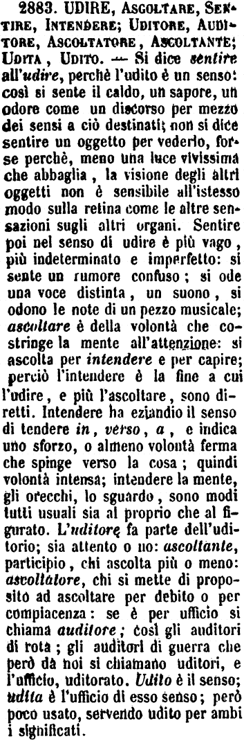 Udire, Ascoltare, Sentire, Intendere; Uditore, Auditore, Ascoltatore, Ascoltante; Udita, Udito - Si dice sentire all'udire, perchè l'udito è un senso: così si sente il caldo, un sapore, un odore come un discorso per mezzo dei sensi a ciò destinati; non si dice sentire un oggetto per vederlo, forse perchè, meno una luce vivissima che abbaglia, la visione degli altri oggetti non è sensibile all'istesso modo sulla retina come le altre sensazioni sugli altri organi. Sentire poi nel senso di udire è più vago, più indeterminato e imperfetto: si sente un rumore confuso; si ode una voce distinta, un suono, si odono le note di un pezzo musicale; ascoltare è della volontà che costringe la mente all'attenzione: si ascolta per intendere e per capire; perciò l'intendere è la fine a cui l'udire, e più l'ascoltare, sono diretti. Intendere ha eziandio il senso di tendere in, verso, a, e indica uno sforzo, o almeno volontà ferma che spinge verso la cosa; quindi volontà intensa; intendere la mente, gli orecchi, lo sguardo, sono modi tutti usuali sia al proprio che al figurato. L'uditore fa parte dell'uditorio; sia attento o no: ascoltante, participio, chi ascolta più o meno: ascoltatore, chi si mette di proposito ad ascoltare per debito o per compiacenza: se è per ufficio si chiama auditore; così gli auditori di rota; gli auditori di guerra che però da noi si chiamano uditori, e l'ufficio, uditorato. Udito è il senso; udita è l'ufficio di esso senso; però poco usato, servendo udito per ambi i significati. [immagine]
