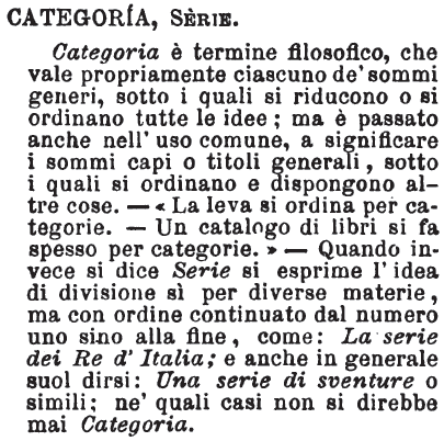 | Categoria, Serie - Categoria è termine filosofico, che vale propriamente ciascuno de' sommi generi, sotto i quali si riducono o si ordinano tutte le idee; ma è passato anche nell'uso comune, a significare i sommi capi o titoli generali, sotto i quali si ordinano e dispongono altre cose. - «La leva si ordina per categorie. - Un catalogo di libri si fa spesso per categorie.» - Quando invece si dice Serie si esprime l'idea di divisione sì per diverse materie, ma con ordine continuato dal numero uno sino alla fine, come: La serie dei Re d'Italia; e anche in generale suol dirsi: Una serie di sventure o simili; né quali casi non si direbbe mai Categoria. [immagine] |