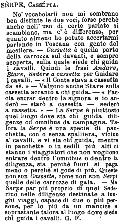 Serpe, Cassetta - Ne' vocabolarii non mi sembrano ben distinte le due voci, forse perché anche nell'uso di certe parlate si scambiano, ma c'è differenza, per quanto almeno ho potuto accertarmi parlando in Toscana con gente del mestiere. - Cassetta è quella parte della carrozza sul davanti, e sempre scoperta, sulla quale siede chi guida i cavalli. Quindi le frasi Andare, Stare, Sedere a cassetta per Guidare i cavalli. - «Il conte stava a cassetta da sè.» - Valgono anche Stare sulla cassetta accanto a chi guida. - «Faccia entrar dentro la signora e io anderò - starò a cassetta - sederò a cassetta.» - La Serpe è piuttosto quel luogo dove sta chi guida diligenze od omnibus da campagna. Talora la Serpe è una specie di panchetta, con o senza spalliera, vicino a' cavalli, e vi sta chi guida, mentre in panchette o in sedili più alti ci stanno i viaggiatori che non vogliono entrare dentro l'omnibus o dentro la diligenza, sia perchè fuori si paga meno o perché si gode di più. Queste non son Cassette, come non son Serpi quelle delle carrozze di gala. - Ma Serpe par più proprio di quel Sederino nelle diligenze destinate a lunghi viaggi, capace di due o più persone, per lo più da un mantice e soprastante talora al luogo dove siede chi guida i cavalli. G. F. [immagine]