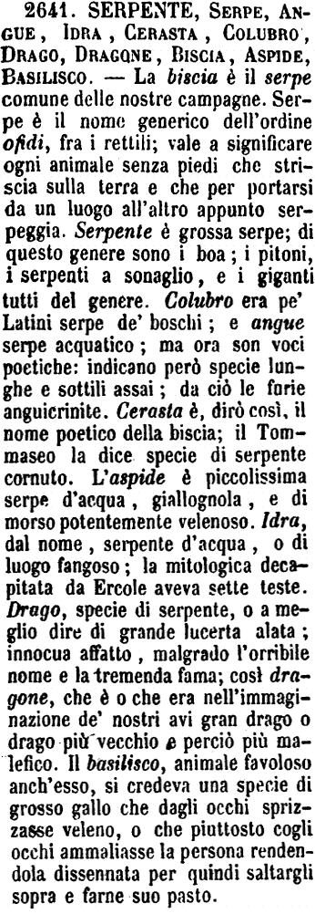 Serpente, Serpe, Angue, idra, Cerasta, Colubro, Drago, Dragone, Biscia, Aspide, Basilisco - La biscia è il serpe comune delle nostre campagne. Serpe è il nome generico dell'ordine ofidi, fra i rettili; vale a significare ogni animale senza piedi che striscia sulla terra e che per portarsi da un luogo all'altro appunto serpeggia. Serpente è grossa serpe; di questo genere sono i boa; i pitoni, i serpenti a sonaglio, e i giganti tutti del genere. Colubro era pe' Latini serpe de' boschi; e angue serpe acquatico; ma ora son voci poetiche: indicano però specie lunghe e sottili assai; da ciò le furie anguicrinite. Cerasta è, dirò così, il nome poetico della biscia; il Tommaseo la dice specie di serpente cornuto. L'aspide è piccolissima serpe d'acqua, giallognola, e di morso potentemente velenoso. Idra, dal nome, serpente d'acqua, o di luogo fangoso; la mitologica decapitata da Ercole aveva sette teste. Drago, specie di serpente, o a meglio dire di grande lucerta alata; innocua affatto, malgrado l'orribile nome e la tremenda fama; così dragone, che è o che era nell'immaginazione de' nostri avi gran drago o drago più vecchio e perciò più malefico. Il basilisco, animale favoloso anch'esso, si credeva una specie di grosso gallo che dagli occhi sprizzasse veleno, o che piuttosto cogli occhi ammaliasse la persona rendendola dissennata per quindi saltargli sopra e farne suo pasto. [immagine]