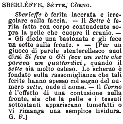 Sberleffe, Sette, Corno - Sberleffe è ferita lacerata e irregolare sulla faccia. - Il Sette è ferita fatta con corpo contundente sopra la pelle che cuopre il cranio. - «Gli diede una bastonata e gli fece un sette sulla fronte.» - [Per un giuoco di parole stenterellesco suol dirsi Si fece o Gli fece un sette che pareva un quattordici, quando il sette sia molto esteso. Lo scherzo è fondato sulla rassomiglianza che tali ferite hanno spesso col segno del numero sette, onde il nome. - Il Corno è l'effetto di una contusione sulla fronte, sia che la pelle e i tessuti sottostanti appariscano tumefatti o vi rimanga una semplice lividura. G.F.] [immagine]