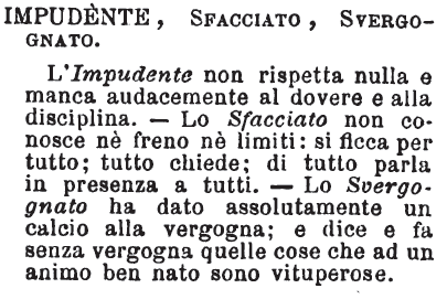 Impudente, Sfacciato, Svergognato - L'Impudente non rispetta nulla e manca audacemente al dovere e alla disciplina. - Lo Sfacciato non conosce nè freno nè limiti: si ficca per tutto; tutto chiede; di tutto parla in presenza a tutti. - Lo Svergognato ha dato assolutamente un calcio alla vergogna; e dice e fa senza vergogna quelle cose che ad un animo ben nato sono vituperose. [immagine]