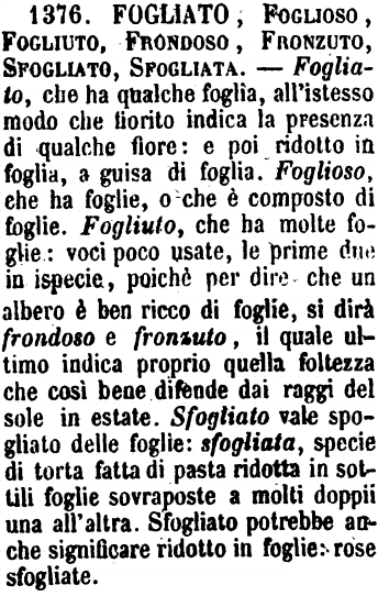 | Fogliato, Foglioso, Fogliuto, Frondoso, Fronzuto, Sfogliato, Sfogliata - Fogliato, che ha qualche foglia, all'istesso modo che fiorito indica la presenza di qualche fiore: e poi ridotto in foglia, a guisa di foglia. Foglioso, che ha foglie, o che è composto di foglie. Fogliuto, che ha molte foglie: voci poco usate, le prime due in ispecie, poichè per dire che un albero è ben ricco di foglie, si dirà frondoso e fronzuto, il quale ultimo indica proprio quella foltezza che così bene difende dai raggi del sole in estate. Sfogliato vale spogliato delle foglie: sfogliata, specie di torta fatta di pasta ridotta in sottili foglie sovraposte a molti doppii una all'altra. Sfogliato potrebbe anche significare ridotto in foglie: rose sfogliate. [immagine] |