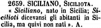 | Siciliano, Siciliota - «Siciliano, nato in Sicilia; Sicilioti dicevansi gli abitanti in Sicilia, ma quivi non nati». A. [immagine] |