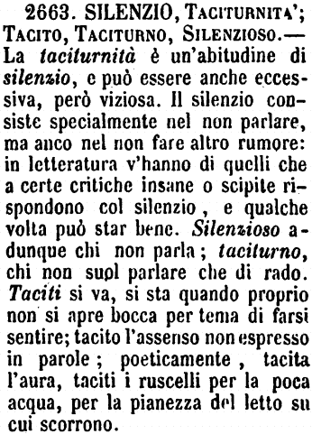 | Silenzio, Taciturnità; Tacito, Taciturno, Silenzioso - La taciturnità è un'abitudine di silenzio, e può essere anche eccessiva, però viziosa. Il silenzio consiste specialmente nel non parlare, ma anco nel non fare altro rumore: in letteratura v'hanno di quelli che a certe critiche insane o scipite rispondono col silenzio, e qualche volta può star bene. Silenzioso adunque chi non parla; taciturno, chi non suol parlare che di rado. Taciti si va, si sta quando proprio non si apre bocca per tema di farsi sentire; tacito l'assenso non espresso in parole; poeticamente, tacita l'aura, taciti i ruscelli per la poca acqua, per la pianezza del letto su cui scorrono. [immagine] |