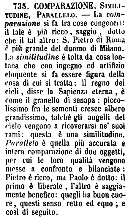 | Comparazione, Similitudine, Parallelo - La comparazione si fa tra cose congeneri: il tale è più ricco, saggio, dotto che il tal altro: S. Pietro di Roma è più grande del duomo di Milano. La similitudine è tolta da cosa lontana che con ingegno ed artifizio eloquente si fa essere figura della cosa di cui si tratta: il regno dei cieli, disse la Sapienza eterna, è come il granello di senapa: piccolissimo fra le sementi cresce albero grandissimo, talchè gli augelli del cielo vengono a ricoverarsi ne' suoi rami: questa è una similitudine. Parallelo è quella più accurata e intera comparazione di due oggetti, per cui le loro qualità vengono messe a confronto e bilanciate: Pietro è ricco, ma Paolo è dotto: il primo è liberale, l'altro è saggiamente benefico: quegli ha buon cuore, questi senso retto ed equo; e così di seguito. [immagine] |
