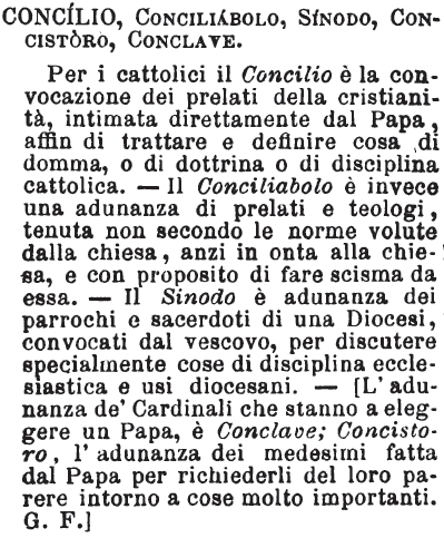 Concilio, Conciliabolo, Sinodo, Concistoro, Conclave - Per i cattolici il Concilio è la convocazione dei prelati della cristianità, intimata direttamente dal Papa, affin di trattare e definire cosa di domma, o di dottrina o di disciplina cattolica. - Il Conciliabolo è invece una adunanza di prelati e teologi, tenuta non secondo le norme volute dalla chiesa, anzi in onta alla chiesa, e con proposito di fare scisma da essa. - Il Sinodo è adunanza dei parrochi e sacerdoti di una Diocesi, convocati dal vescovo, per discutere specialmente cose di disciplina ecclesiastica e usi diocesani. - [L'adunanza de' Cardinali che stanno a eleggere un Papa, è Conclave; Concistoro, l'adunanza dei medesimi fatta dal Papa per richiederli del loro parere intorno a cose molto importanti. G. F.] [immagine]