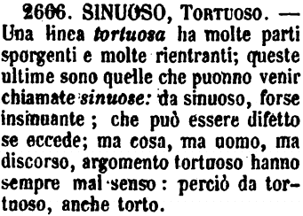 | Sinuoso, Tortuoso - Una linea tortuosa ha molte parti sporgenti e molte rientranti; queste ultime sono quelle che puonno venir chiamate sinuose: da sinuoso, forse insinuante; che può essere difetto se eccede; ma cosa, ma uomo, ma discorso, argomento tortuoso hanno sempre mal senso: perciò da tortuoso, anche torto. [immagine] |
