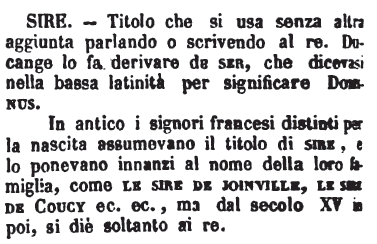| Sire - Titolo che si usa senza altra aggiunta parlando o scrivendo al re. Ducange lo fa derivare da ser, che dicevasi nella bassa latinità per significare Dominus.