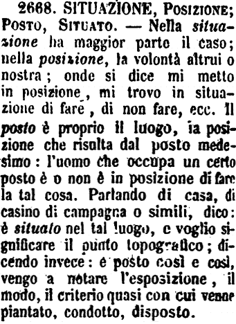 | Situazione, Posizione; Posto, Situato - Nella situazione ha maggior parte il caso; nella posizione, la volontà altrui o nostra; onde si dice mi metto in posizione, mi trovo in situazione di fare, di non fare, ecc. Il posto è proprio il luogo, la posizione che risulta dal posto medesimo: l'uomo che occupa un certo posto è o non è in posizione di fare la tal cosa. Parlando di casa, di casino di campagna o simili, dico: è situato nel tal luogo, e voglio significare il punto topografico; dicendo invece: è posto così e così, vengo a notare l'esposizione, il modo, il criterio quasi con cui venne piantato, condotto, disposto. [immagine] |