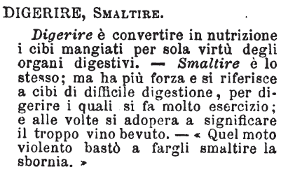 | Digerire, Smaltire - Digerire è convertire in nutrizione i cibi mangiati per sola virtù degli organi digestivi. - Smaltire è lo stesso; ma ha più forza e si riferisce a cibi di difficile digestione, per digerire i quali si fa molto esercizio; e alle volte si adopera a significare il troppo vino bevuto. - «Quel moto violento bastò a fargli smaltire la sbornia.» [immagine] |