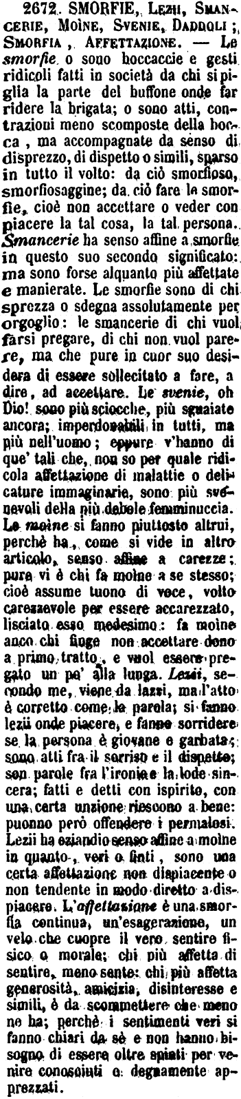 | Smorfie, Lezii, Smancerie, Moìne, Svenie, Daddole; Smorfia, Affettazione - Le smorfie o sono boccaccie e gesti ridicoli fatti in società da chi si piglia la parte del buffone onde far ridere la brigata; o sono atti, contrazioni meno scomposte della bocca, ma accompagnate da senso di disprezzo, di dispetto o simili, sparso in tutto il volto: da ciò smorfioso, smorfiosaggine; da ciò fare le smorfie, cioè non accettare o veder con piacere la tal cosa, la tal persona. Smancerie ha senso affine a smorfie in questo suo secondo significato: ma sono forse alquanto più affettate e manierate. Le smorfie sono di chi sprezza o sdegna assolutamente per orgoglio: le smancerie di chi vuol farsi pregare, di chi non vuol parere, ma che pure in cuor suo desidera di essere sollecitato a fare, a dire, ad accettare. Le svenie, oh Dio! sono più sciocche, più sguaiate ancora; imperdonabili in tutti, ma più nell'uomo; eppure v'hanno di que' tali che, non so per quale ridicola affettazione di malattie o delicature immaginarie, sono più svenevoli della più debole femminuccia. Le moìne si fanno piuttosto altrui, perchè ha, come si vide in altro articolo, senso affine a carezze; pure vi è chi fa moìne a se stesso; cioè assume tuono di voce, volto carezzevole per essere accarezzato, lisciato esso medesimo: fa moìne anco chi finge non accettare dono a primo tratto, e vuol essere pregato un po' alla lunga. Lezii, secondo me, viene da lazzi, ma l'atto è corretto come la parola; si fanno lezii onde piacere, e fanno sorridere se la persona è giovane e garbata; sono atti fra il sorriso e il dispetto; son parole fra l'ironia e la lode sincera; fatti e detti con ispirito, con una certa unzione riescono a bene: puonno però offendere i permalosi. Lezii ha eziandio senso affine a moìne in quanto, veri o finti, sono una certa affettazione non dispiacente o non tendente in modo diretto a dispiacere. L'affettazione è una smorfia continua, un'esagerazione, un velo che cuopre il vero sentire fisico o morale; chi più affetta di sentire, meno sente: chi più affetta generosità, amicizia, disinteresse e simili, è da scommettere che meno ne ha; perchè i sentimenti veri si fanno chiari da sè e non hanno bisogno di essere oltre spinti per venire conosciuti o degnamente apprezzati. [immagine] |
