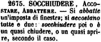 Socchiudere, Accostare, Abbattere - Si abbatte un'imposta di finestra; si accostano tutte e due; socchiudere poi o è un quasi chiudere, o un quasi aprire, secondo il caso. [immagine]