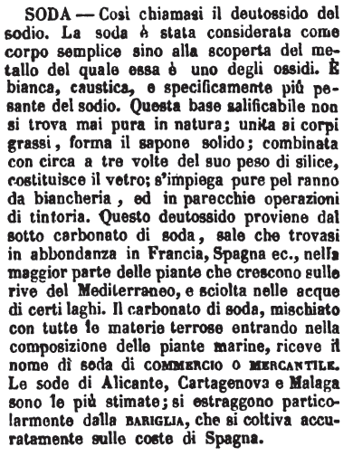Soda - Così chiamasi il deutossido del sodio. La soda è stata considerata come corpo semplice sino alla scoperta del metallo del quale essa è uno degli ossidi. E' bianca, caustica, e specificamente più pesante del sodio. Questa base salificabile non si trova mai pura in natura; unita ai corpi grassi, forma il sapone solido; combinata con circa a tre volte del suo peso di silice, costituisce il vetro; s'impiega pure pel ranno da biancheria, ed in parecchie operazioni di tintoria. Questo deutossido proviene dal sotto carbonato di soda, sale che trovasi in abbondanza in Francia, Spagna ec., nella maggior parte delle piante che crescono sulle rive del Mediterraneo, e sciolta nelle acque di certi laghi. Il carbonato di soda, mischiato con tutte le materie terrose entrando nella composizione delle piante marine, riceve il nome di soda di commercio o mercantile. Le sode di Alicante, Cartagenova e Malaga sono le più stimate; si estraggono particolarmente dalla bariglia, che si coltiva accuratamente sulle coste di Spagna. [immagine]