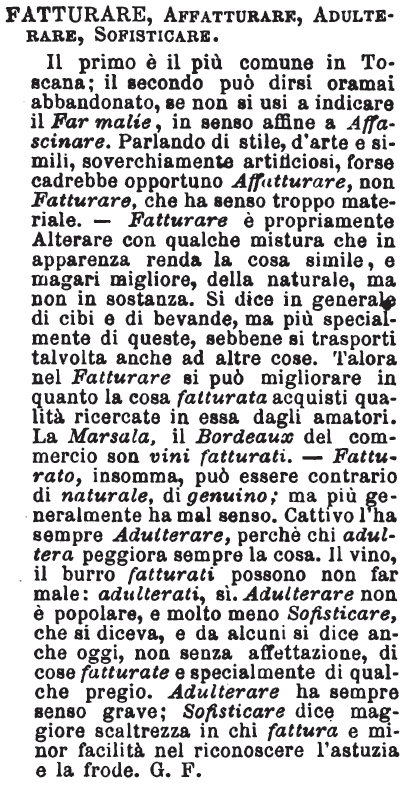 | Fatturare, Affatturare, Adulterare, Sofisticare - Il primo è il più comune in Toscana; il secondo può dirsi oramai abbandonato, se non si usi a indicare il Far malìe, in senso affine a Affascinare. Parlando di stile, d'arte e simili, soverchiamente artificiosi, forse cadrebbe opportuno Affatturare, non Fatturare, che ha senso troppo materiale. — Fatturare è propriamente Alterare con qualche mistura che in apparenza renda la cosa simile, e magari migliore, della naturale, ma non in sostanza. Si dice in generale di cibi e di bevande, ma più specialmente di queste, sebbene si trasporti talvolta anche ad altre cose. Talora nel Fatturare si può migliorare in quanto la cosa fatturata acquisti qualità ricercate in essa dagli amatori. La Marsala, il Bordeaux del commercio son vini fatturati. — Fatturato, insomma, può essere contrario di naturale, di genuino; ma più generalmente ha mal senso. Cattivo l'ha sempre Adulterare, perchè chi adultera peggiora sempre la cosa. Il vino, il burro fatturati possono non far male: adulterati, si. Adulterare non è popolare, e molto meno Sofisticare, che si diceva, e da alcuni si dice anche oggi, non senza affettazione, di cose fatturate e specialmente di qualche pregio. Adulterare ha sempre senso grave; Sofisticare dice maggiore scaltrezza in chi fattura e minor facilità nel riconoscere l'astuzia e la frode. G. F. [immagine] |