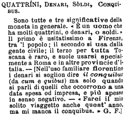 Quattrini, Denari, Soldi, Conquibus - Sono tutte e tre significative della moneta in generale. «È un uomo che ha molti quattrini, o denari, o soldi.» Il primo è usitatissimo a Firenze, tra 'l popolo; il secondo si usa dalla gente civile; il terzo per tutta Toscana è raro, e suole usarsi specialmente a Roma e in altre provincie d'Italia. - [Nell'uso familiare fiorentino i denari si soglion dire il conquibus (da com e quibus) ma solo quando si parli di quelli che occorrono a una data spesa od impresa, e più spesso in senso negativo. - «Farei il mio solito viaggetto anche quest'anno, ma mi manca il conquibus.» G. F.] [immagine]