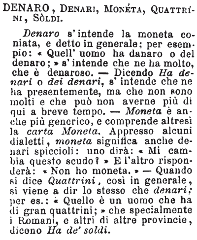 Denaro, Denari, Moneta, Quattrini, Soldi - Denaro s'intende la moneta coniata, e detto in generale; per esempio: «Quell'uomo ha danaro o del denaro;» s'intende che ne ha molto, che è denaroso. - Dicendo Ha denari o dei denari, s'intende che ne ha presentemente, ma che non sono molti e che può non averne più di qui a breve tempo. - Moneta è anche più generico, e comprende altresì la carta Moneta. Appresso alcuni dialetti, moneta significa anche denari spiccioli: uno dirà: «Mi cambia questo scudo?» E l'altro risponderà: «Non ho moneta.» - Quando si dice Quattrini, così in generale, si viene a dir lo stesso che denari; per es.: «Quello è un uomo che ha di gran quattrini;» che specialmente i Romani, e altri di altre provincie, dicono Ha de' soldi. [immagine]