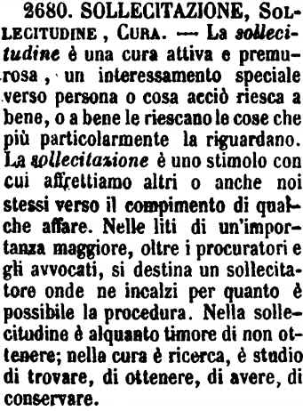 | Sollecitazione, Sollecitudine, Cura - La sollecitudine è una cura attiva e premurosa, un interessamento speciale verso persona o cosa acciò riesca a bene, o a bene le riescano le cose che più particolarmente la riguardano. La sollecitazione è uno stimolo con cui affrettiamo altri o anche noi stessi verso il compimento di qualche affare. Nelle liti di un'importanza maggiore, oltre i procuratori e gli avvocati, si destina un sollecitatore onde ne incalzi per quanto è possibile la procedura. Nella sollecitudine è alquanto timore di non ottenere; nella cura è ricerca, è studio di trovare, di ottenere, di avere, di conservare. [immagine] |