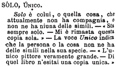 | Solo, Unico - Solo è colui, o quella cosa, che attualmente non ha compagnia, o non ne ha niuna delle simili. - « Sta sempre solo. - Mi è rimasta questa copia sola. » - La voce Unico indica che la persona o la cosa non ne ha delle simili nella sua specie. - « L'unico pittore veramente grande. - Di quel libro n'esitai una copia unica. » [immagine] |