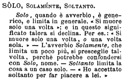 | Solo, Solamente, Soltanto - Solo, quando è avverbio, è generico, e limita in generale. «Si muore solo una volta»; e in questo significato talora si declina. Per es.: «Si muore solo una volta, o una volta sola.» - L'avverbio Solamente, che limita un poco più, si presceglie talvolta, perchè potrebbe confondersi con Solo, nome. Soltanto limita la cosa a un caso solo. - «Ho accettato soltanto per far piacere a lei.» [immagine] |