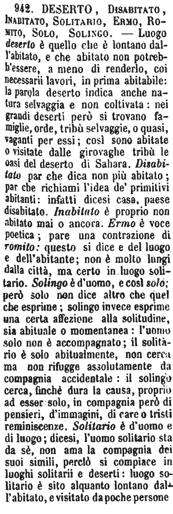 | Deserto, Disabitato, Inabitato, Solitario, Ermo, Romito, Solo, Solingo - Luogo deserto è quello che è lontano dall'abitato, e che abitato non potrebb'essere, a meno di renderlo, coi necessarii lavori, in prima abitabile: la parola deserto indica anche natura selvaggia e non coltivata: nei grandi deserti però si trovano famiglie, orde, tribù selvaggie, o quasi, vaganti per essi; così sono abitate o visitate dalle girovaghe tribù le oasi del deserto di Sahara. Disabitato par che dica non più abitato; par che richiami l'idea de' primitivi abitanti: infatti dicesi casa, paese disabitato. Inabitato è proprio non abitato mai o ancora. Ermo è voce poetica; pare una contrazione di romito: questo si dice e del luogo e dell'abitante; non è molto lungi dalla città, ma certo in luogo solitario. Solingo è d'uomo, e così solo; però solo non dice altro che quel che esprime; solingo invece esprime una certa affezione alla solitudine, sia abituale o momentanea: l'uomo solo non è accompagnato; il solitario è solo abitualmente, non cerca ma non rifugge assolutamente da compagnia accidentale: il solingo cerca, finchè dura la causa, proprio ad esser solo, in compagnia però di pensieri, d'immagini, di care o tristi reminiscenze. Solitario è d'uomo e di luogo; dicesi, l'uomo solitario sta da sè, non ama la compagnia dei suoi simili, perciò si compiace in luoghi solitarii e deserti: luogo solitario è sito alquanto lontano dall'abitato, e visitato da poche persone. [immagine] |