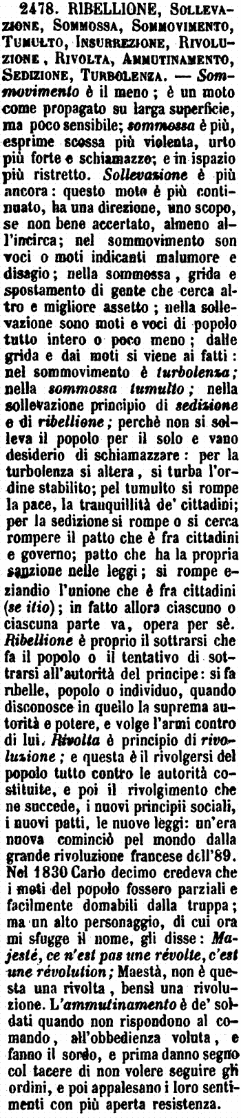 | Ribellione, Sollevazione, Sommossa, Sommovimento, Tumulto, Insurrezione, Rivoluzione, Rivolta, Ammutinamento, Sedizione, Turbolenza - Sommovimento è il meno; è un moto come propagato su larga superficie, ma poco sensibile; sommossa è più, esprime scossa più violenta, urto più forte e schiamazzo; e in ispazio più ristretto. Sollevazione è più ancora: questo moto è più continuato, ha una direzione, uno scopo, se non bene accertato, almeno all'incirca; nel sommovimento son voci o moti indicanti malumore e disagio; nella sommossa, grida e spostamento di gente che cerca altro e migliore assetto; nella sollevazione sono moti e voci di popolo tutto intero o poco meno; dalle grida e dai moti si viene ai fatti: nel sommovimento è turbolenza; nella sommossa tumulto; nella sollevazione principio di sedizione e di ribellione; perchè non si solleva il popolo per il solo e vano desiderio di schiamazzare: per la turbolenza si altera, si turba l'ordine stabilito; pel tumulto si rompe la pace, la tranquillità de' cittadini; per la sedizione si rompe o si cerca rompere il patto che è fra cittadini e governo; patto che ha la propria sanzione nelle leggi; si rompe eziandio l'unione che è fra cittadini (se itio); in fatto allora ciascuno o ciascuna parte va, opera per sè. Ribellione è proprio il sottrarsi che fa il popolo o il tentativo di sottrarsi all'autorità del principe: si fa ribelle, popolo o individuo, quando disconosce in quello la suprema autorità e potere, e volge l'armi contro di lui. Rivolta è principio di rivoluzione; e questo è il rivolgersi del popolo tutto contro le autorità costituite, e poi il rivolgimento che ne succede, i nuovi principii sociali, i nuovi patti, le nuove leggi: un'era nuova cominciò pel mondo dalla grande rivoluzione francese dell'89. Nel 1830 Carlo decimo credeva che i moti del popolo fossero parziali e facilmente domabili dalla truppa; ma un alto personaggio, di cui ora mi sfugge il nome, gli disse: Majesté, ce n'est pas une révolte, c'est une révolution; Maestà, non è questa una rivolta, bensì una rivoluzione. L'ammutinamento è de' soldati quando non rispondono al comando, all'obbedienza voluta, e fanno il sordo, e prima danno segno col tacere di non volere seguire gli ordini, e poi appalesano i loro sentimenti con più aperta resistenza. [immagine] |