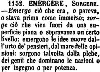 | Emergere, Sorgere - Emerge ciò che era, o pareva, o stava prima come immerso; sorge ciò che vien fuori da una superficie piana o sopravanza un certo livello: emergono le idee nuove dall'urto de' pensieri, dal mare delle opinioni: sorgono talvolta dalla plebe, dei genii che dominano le nazioni o per ingegno o per potenza. [immagine] |
