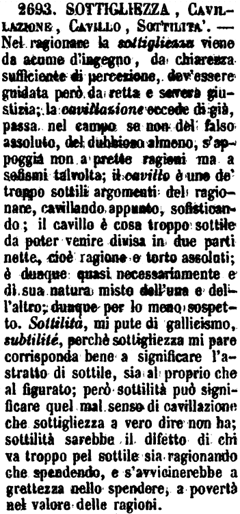 | Sottigliezza, Cavillazione, Cavillo, Sottilità - Nel ragionare la sottigliezza viene da acume d'ingegno, da chiarezza sufficiente di percezione, dev'essere guidata però da retta e severa giustizia; la cavillazione eccede di già, passa nel campo se non del falso assoluto, del dubbioso almeno, s'appoggia non a prette ragioni ma a sofismi talvolta; il cavillo è uno de' troppo sottili argomenti del ragionare, cavillando appunto, sofisticando; il cavillo è cosa troppo sottile da poter venire divisa in due parti nette, cioè ragione e torto assoluti; è dunque quasi necessariamente e di sua natura misto dell'una e dell'altro; dunque per lo meno sospetto. Sottilità, mi pute di gallicismo, subtilité, perchè sottigliezza mi pare corrisponda bene a significare l'astratto di sottile, sia al proprio che al figurato; però sottilità può significare quel mal senso di cavillazione che sottigliezza a vero dire non ha; sottilità sarebbe il difetto di chi va troppo pel sottile sia ragionando che spendendo, e s'avvicinerebbe a grettezza nello spendere, a povertà nel valore delle ragioni. [immagine] |