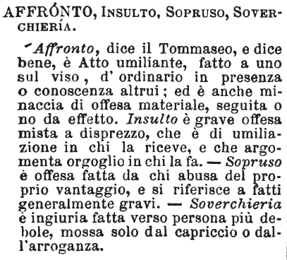 Affronto, Insulto, Sopruso, Soverchieria - Affronto, dice il Tommaseo, e dice bene, è Atto umiliante, fatto a uno sul viso, d'ordinario in presenza o conoscenza altrui; ed è anche minaccia di offesa materiale, seguita o no da effetto. Insulto è grave offesa mista a disprezzo, che è di umiliazione in chi la riceve, e che argomenta orgoglio in chi la fa. - Sopruso è offesa fatta da chi abusa del proprio vantaggio, e si riferisce a fatti generalmente gravi. - Soverchieria è ingiuria fatta verso persona più debole, mossa solo dal capriccio o dall'arroganza. [immagine]
