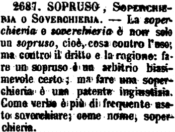 Sopruso, Soperchieria o Soverchieria - La soperchieria o soverchieria è non solo un sopruso, cioè, cosa contro l'uso; ma contro il diritto e la ragione: fare un sopruso è un arbitrio biasimevole certo; ma fare una soperchieria è una patente ingiustizia. Come verbo è più di frequente usato soverchiare; come nome, soperchieria. [immagine]