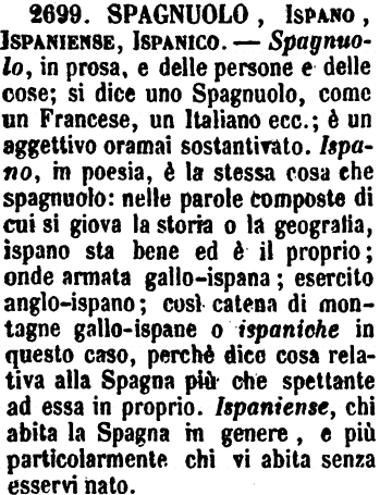 | Spagnuolo, Ispano, Ispaniense, Ispanico - Spagnuolo, in prosa, e delle persone e delle cose; si dice uno Spagnuolo, come un Francese, un Italiano ecc.; è un aggettivo oramai sostantivato. Ispano, in poesia, è la stessa cosa che spagnuolo: nelle parole composte di cui si giova la storia o la geografia, ispano sta bene ed è il proprio; onde armata gallo-ispana; esercito anglo-ispano; così catena di montagne gallo-ispane o ispaniche in questo caso, perchè dice cosa relativa alla Spagna più che spettante ad essa in proprio. Ispaniense, chi abita la Spagna in genere, e più particolarmente chi vi abita senza esservi nato. [immagine] |