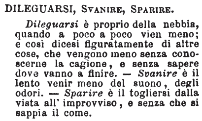 Dileguarsi, Svanire, Sparire - Dileguarsi è proprio della nebbia, quando a poco a poco vien meno; e così dicesi figuratamente di altre cose, che vengono meno senza conoscerne la cagione, e senza sapere dove vanno a finire. - Svanire è il lento venir meno del suono, degli odori. - Sparire è il togliersi dalla vista all'improvviso, e senza che si sappia il come. [immagine]