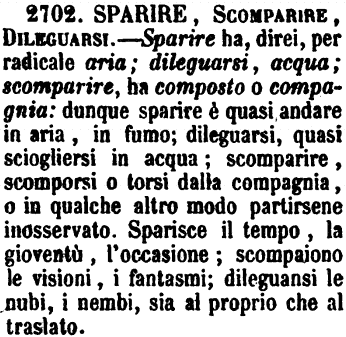 Sparire, Scomparire, Dileguarsi - Sparire ha, direi, per radicale aria; dileguarsi, acqua; scomparire ha composto o compagnia: dunque sparire è quasi andare in aria, in fumo; dileguarsi, quasi sciogliersi in acqua; scomparire, scomporsi o torsi dalla compagnia, o in qualche altro modo partirsene inosservato. Sparisce il tempo, la gioventù, l'occasione; scompaiono le visioni, i fantasmi; dileguansi le nubi, i nembi, sia al proprio che al traslato. [immagine]