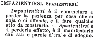 | Impazientirsi, Spazientirsi - Impazientirsi è il cominciare a perder la pazienza per cosa che ci noja o ci offende, e il fare qualche atto da mostrarlo. - Spazientirsi è il perderla affatto, è il manifestarlo con atti e parole d'ira e di sdegno. [immagine] |