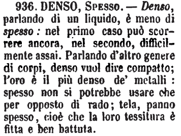 Denso, Spesso - Denso, parlando di un liquido, è meno di spesso: nel primo caso può scorrere ancora, nel secondo, difficilmente assai. Parlando d'altro genere di corpi, denso vuol dire compatto; l'oro è il più denso de' metalli: spesso non si potrebbe usare che per opposto di rado; tela, panno spesso, cioè che la loro tessitura è fitta e ben battuta. [immagine]
