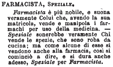 Farmacista, Speziale - Farmacista è più nobile, e suona veramente Colui che, avendo la sua matricola, vende e manipola i farmachi per uso della medicina. - Speziale sonerebbe veramente Chi vende le spezie, che sono roba da cucina; ma come alcune di esse si vendono anche alla farmacia, così si cominciò a dire, e si dura anche adesso, Speziale per Farmacista. [immagine]