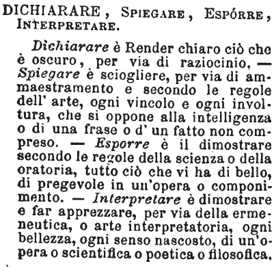 Dichiarare, Spiegare, Esporre, Interpretare - Dichiarare è Render chiaro ciò che è oscuro, per via di raziocinio. - Spiegare è sciogliere, per via di ammaestramento e secondo le regole dell'arte, ogni vincolo e ogni involtura, che si oppone alla intelligenza o di una frase o d'un fatto non compreso. - Esporre è il dimostrare secondo le regole della scienza o della oratoria, tutto ciò che vi ha di bello, di pregevole in un'opera o componimento. - Interpretare è dimostrare e far apprezzare, per via della ermeneutica, o arte interpretatoria, ogni bellezza, ogni senso nascosto, di un'opera o scientifica o poetica o filosofica. [immagine]