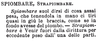 Spiombare, Strapiombare - Spiombare suol dirsi di cosa assai pesa, che tenendola in mano ci tiri quasi in giù le braccia, come se in fondo avesse del piombo. - Strapiombare è Venir fuori dalla dirittura per eccedente peso dall'una delle parti. [immagine]