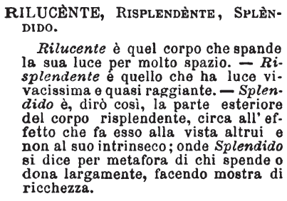 | Rilucente, Risplendente, Splendido - Rilucente è quel corpo che spande la sua luce per molto spazio. - Risplendente è quello che ha luce vivacissima e quasi raggiante. - Splendido è, dirò così, la parte esteriore del corpo risplendente, circa all'effetto che fa esso alla vista altrui e non al suo intrinseco; onde Splendido si dice per metafora di chi spende o dona largamente, facendo mostra di ricchezza. [immagine] |