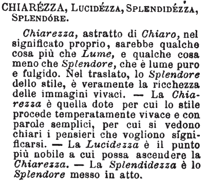 Chiarezza, Lucidezza, Splendidezza, Splendore - Chiarezza, astratto di Chiaro, nel significato proprio, sarebbe qualche cosa più che Lume, e qualche cosa meno che Splendore, che è lume puro e fulgido. Nel traslato, lo Splendore dello stile, è veramente la ricchezza delle immagini vivaci. - La Chiarezza è quella dote per cui lo stile procede temperatamente vivace e con parole semplici, per cui si vedono chiari i pensieri che vogliono significarsi. - La Lucidezza è il punto più nobile a cui possa ascendere la Chiarezza. - La Splendidezza è lo Splendore messo in atto. [immagine]