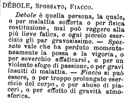 | Debole, Spossato, Fiacco - Debole è quella persona, la quale, o per malattia sofferta o per fisica costituzione, mal può reggere alla più lieve fatica, e ogni piccolo esercizio gli par gravosissimo. - Spossato vale che ha perduto momentaneamente la possa e la vigoria, o per soverchio affaticarsi, o per un violento sfogo di passione, o per gravi insulti di malattia. - Fiacco si può essere, o per troppo prolungato esercizio del corpo, o per abuso di piaceri, o per effetto di gravità atmosferica. [immagine] |