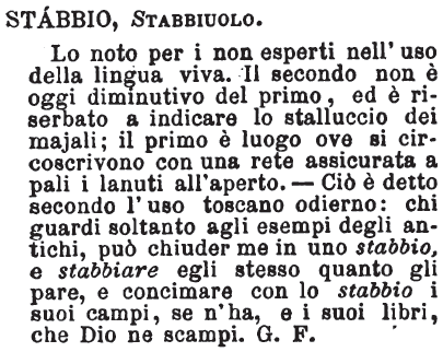 Stabbio, Stabbiuolo - Lo noto per i non esperti nell'uso della lingua viva. Il secondo non è oggi diminutivo del primo, ed è riserbato a indicare lo stalluccio dei majali; il primo è luogo ove si circoscrivono con una rete assicurata a pali i lanuti all'aperto. - Ciò è detto secondo l'uso toscano odierno: chi guardi soltanto agli esempi degli antichi, può chiuder me in uno stabbio, e stabbiare egli stesso quanto gli pare, e concimare con lo stabbio i suoi campi, se n'ha, e i suoi libri, che Dio ne scampi. G. F. [immagine]