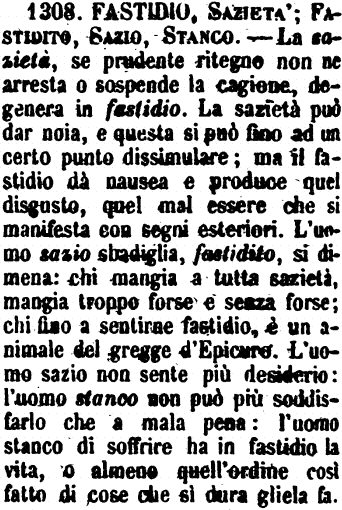 | Fastidio, Sazietà; Fastidito, Sazio, Stanco - La sazietà, se prudente ritegno non ne arresta o sospende la cagione, degenera in fastidio. La sazietà può dar noia, e questa si può fino ad un certo punto dissimulare; ma il fastidio dà nausea e produce quel disgusto, quel mal essere che si manifesta con segni esteriori. L'uomo sazio sbadiglia, fastidito, si dimena: chi mangia a tutta sazietà, mangia troppo forse e senza forse; chi fino a sentirne fastidio, è un animale del gregge d'Epicuro. L'uomo sazio non sente più desiderio: l'uomo stanco non può più soddisfarlo che a mala pena: l'uomo stanco di soffrire ha in fastidio la vita, o almeno quell'ordine così fatto di cose che sì dura gliela fa. [immagine] |