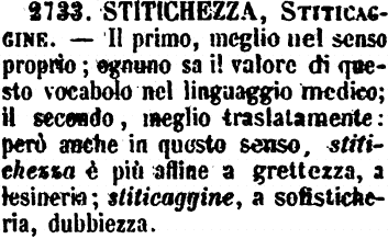 Stitichezza, Stiticaggine - Il primo, meglio nel senso proprio; ognuno sa il valore di questo vocabolo nel linguaggio medico; il secondo, meglio traslatamente: però anche in questo senso, stitichezza è più affine a grettezza, a lesineria; stiticaggine, a sofisticheria, dubbiezza. [immagine]