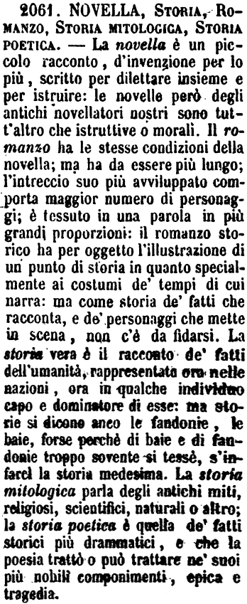 | Novella, Storia, Romanzo, Storia mitologica, Storia poetica - La novella è un piccolo racconto, d'invenzione per lo più, scritto per dilettare insieme e per istruire: le novelle però degli antichi novellatori nostri sono tutt'altro che istruttive o morali. Il romanzo ha le stesse condizioni della novella; ma ha da essere più lungo; l'intreccio suo più avviluppato comporta maggior numero di personaggi; è tessuto in una parola in più grandi proporzioni: il romanzo storico ha per oggetto l'illustrazione di un punto di storia in quanto specialmente ai costumi de' tempi di cui narra: ma come storia de' fatti che racconta, e de' personaggi che mette in scena, non c'è da fidarsi. La storia vera è il racconto de' fatti dell'umanità, rappresentata ora nelle nazioni, ora in qualche individuo capo e dominatore di esse: ma storie si dicono anco le fandonie, le baie, forse perchè di baie e di fandonie troppo sovente si tessè, s'infarcì la storia medesima. La storia mitologica parla degli antichi miti, religiosi, scientifici, naturali o altro; la storia poetica è quella de' fatti storici più drammatici, e che la poesia trattò o può trattare ne' suoi più nobili componimenti, epica e tragedia. [immagine] |
