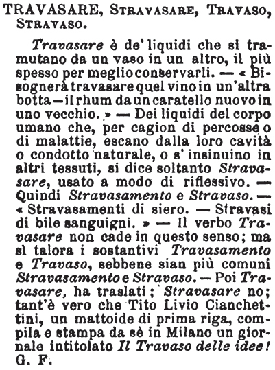 Travasare, Stravasare, Travaso, Stravaso - Travasare è de' liquidi che si tramutano da un vaso in un altro, il più spesso per meglio conservarli. - «Bisognerà travasare quel vino in un'altra botta - il rhum da un caratello nuovo in uno vecchio.» - Dei liquidi del corpo umano che, per cagion di percosse o di malattie, escano dalla loro cavità o condotto naturale, o s'insinuino in altri tessuti, si dice soltanto Stravasare, usato a modo di riflessivo. - Quindi Stravasamento e Stravaso. - «Stravasamenti di siero. - Stravasi di bile sanguigni.» - Il verbo Travasare non cade in questo senso; ma sì talora i sostantivi Travasamento e Travaso, sebbene sian più comuni Stravasamento e Stravaso. - Poi Travasare, ha traslati; Stravasare no; tant'è vero che Tito Livio Cianchettini, un mattoide di prima riga, compila e stampa da sè in Milano un giornale intitolato Il Travaso delle idee! G. F. [immagine]