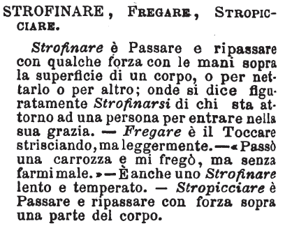 | Strofinare, Stropicciare; Stropeccìo, Fruscìo - Lo strofinare non manda suono o almeno leggerissimo; lo stropicciare, sì: dal fruscio di una veste di seta di una signora che passa, allo stropiccìo de' passi di molte persone o anco d'una sola c'è gran differenza. Strofinare, alla lettera, pare voglia dire fregare con straccio fino, e poi per deduzione di conseguenza in conseguenza, pulire leggermente con cosa fina: stropicciare, pure alla lettera, fare strepito coi piedi e poi per similitudine fregare con più forza. Da qui il leggero suono mandato dalla prima di queste azioni, e il più grave della seconda. [immagine] |
