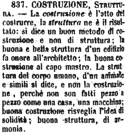 Costruzione, Struttura - La costruzione è l'atto del costrurre, la struttura ne è il risultato: si dice un buon metodo di costruzione e non di struttura; la buona e bella struttura d'un edifizio fa onore all'architetto; la buona costruzione al capo mastro. La struttura del corpo umano, d'un animale e simili si dice, e non la costruzione, perchè non son fatti pezzo a pezzo come una casa, una macchina; buona costruzione risveglia l'idea di solidità; buona struttura, di armonia. [immagine]